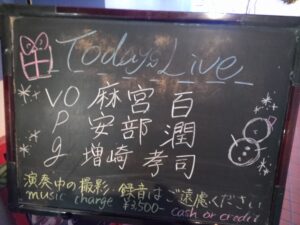 最後にアンコールで「ツイストアンドシャウト」で〆まして盛り上がったライブも終了しました。三人のハモリもカッコよく( ^ω^)・・・。この老人バンド、是非また聴きにお邪魔したいと思います。また来年も宜しくお願い致します。<(_ _)>