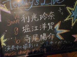 そこそこ席は埋まっている店内、入ってすぐに堀江くんのところへ行って写真を一枚( ´∀` )。利光さんの顔がブレボケだったのが残念(-_-;)。そのあとすぐにライブが始まりました。