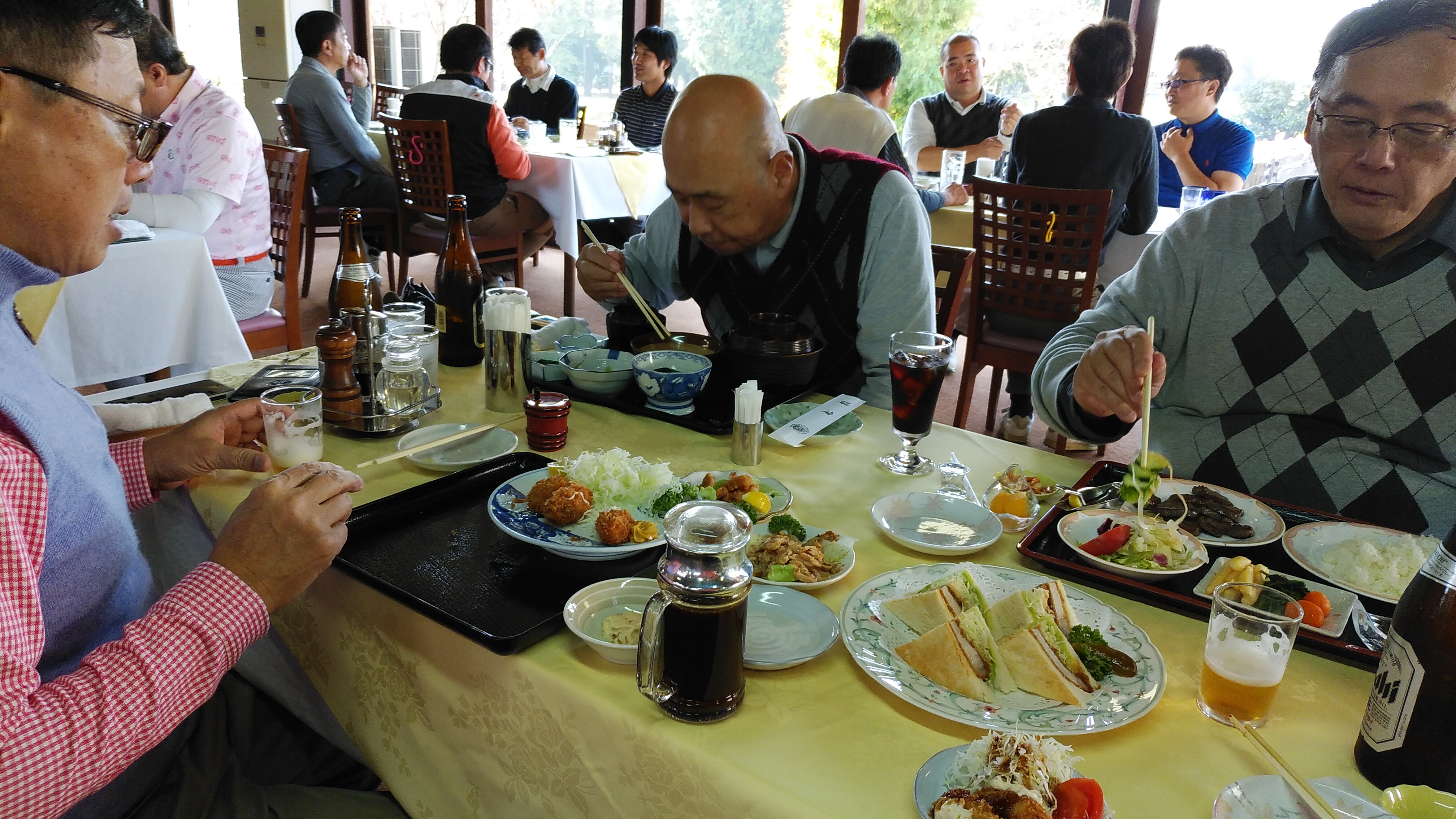 実力的にはトップのGt君、時々悪い癖が出始めると止まらなくなります。先週は97で回ったそうですが、シャンク連発の今日はどうなる事やら・・・?等と言っているうちにハーフターンです。49組とほぼ満員のこの日でしたが、2時間少々でスムースに回って来ましてさぁ、ビールだ!